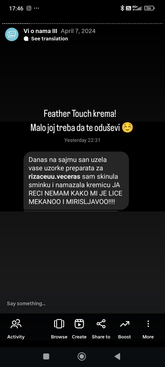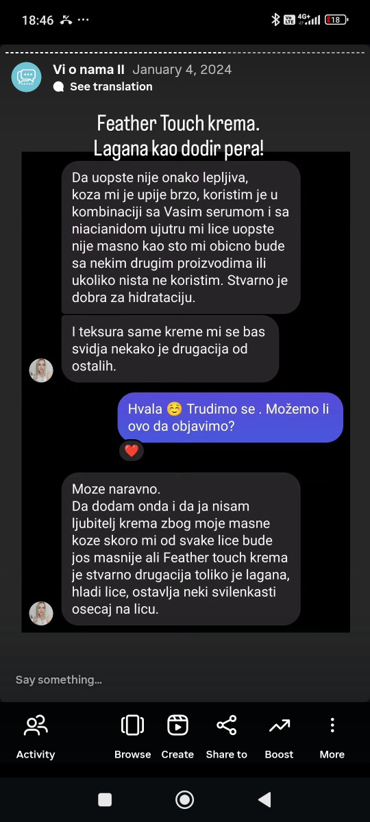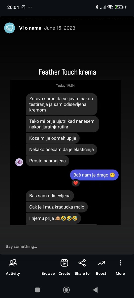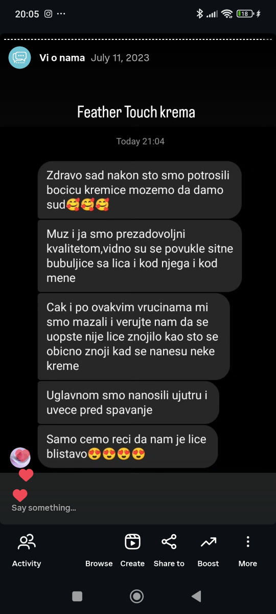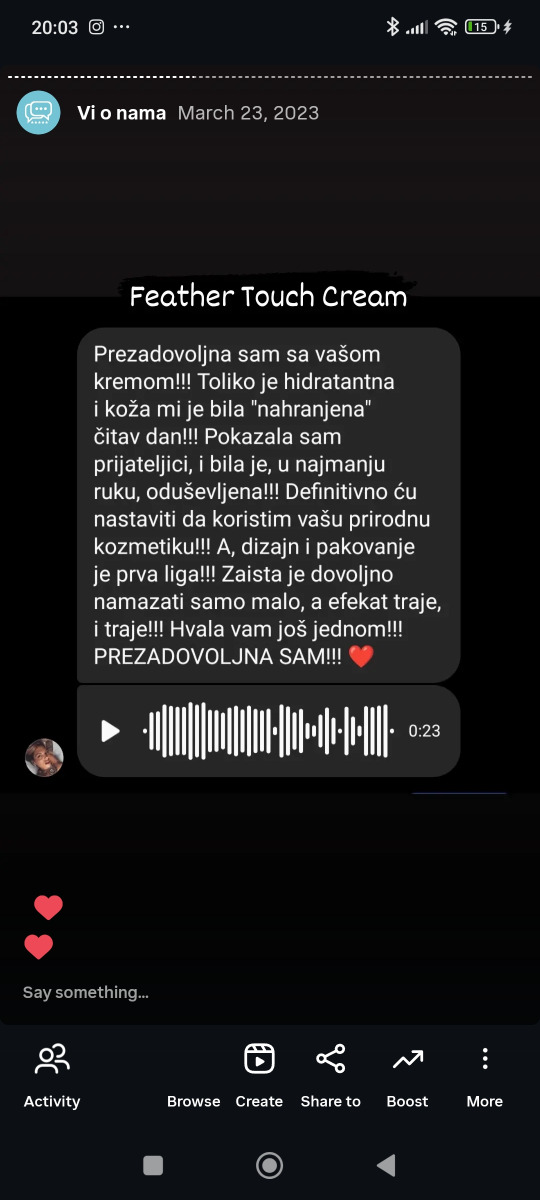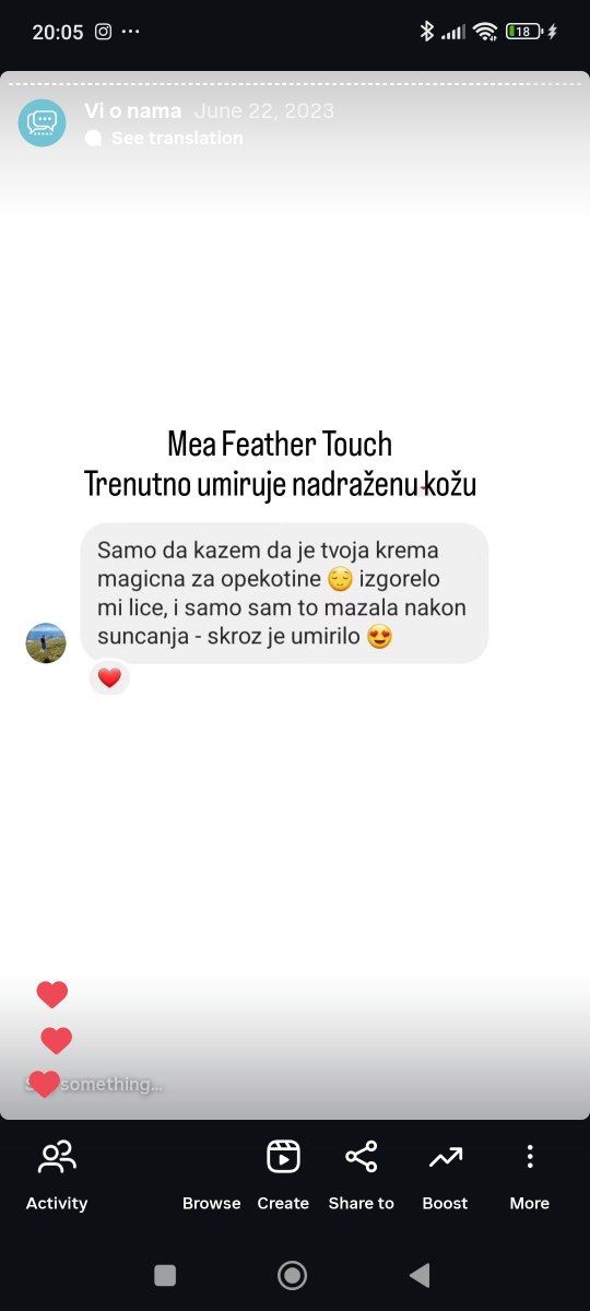 Feather Touch krema je specijalno formulisana za potrebe mešovite i izuzetno osetljive kože, kojoj je potrebna nega koja istovremeno balansira, hidrira i umiruje. Njena napredna formula sa 5 peptida i bakućiolom deluje sinergijski na smanjenje znakova starenja i poboljšanje elastičnosti kože, dok pažljivo odabrani emolijensi i aktivni sastojci čuvaju prirodnu ravnotežu i pomažu koži da se izbori sa spoljnim stresorima. Posebno se izdvaja ulje semenki konoplje, bogato omega masnim kiselinama i antioksidansima, koje u kombinaciji sa bakućiolom dodatno pojačava antiinflamatorno i umirujuće dejstvo. Ova sinergija doprinosi bržem smanjenju crvenila i nadraženosti, čineći Feather Touch idealnim rešenjem za preosetljivu kožu. Krema pruža sve što je koži potrebno i za dnevnu i za noćnu negu, čineći rutinu jednostavnijom. Pogodna je i za delikatnu okoloočnu regiju, gde čuva ravnotežu kože bez izazivanja iritacija. Redovnom upotrebom: