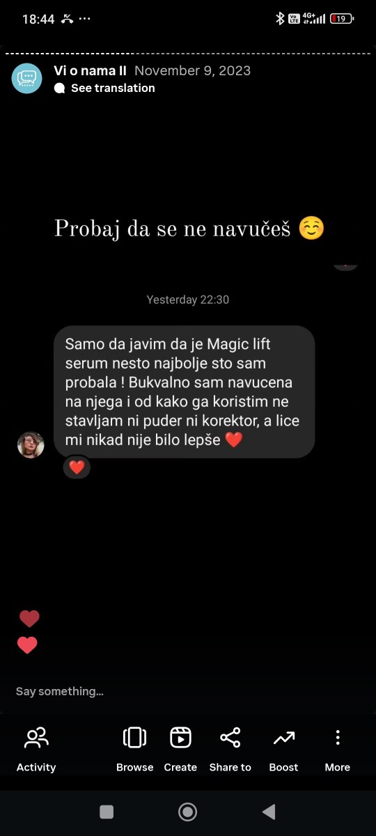 Nakon nanošenja sačekati da se serum potpuno upije. Može se koristiti samostalno, kao podloga za šminku, ili u kombinaciji sa kremom i/ili SPF-om.